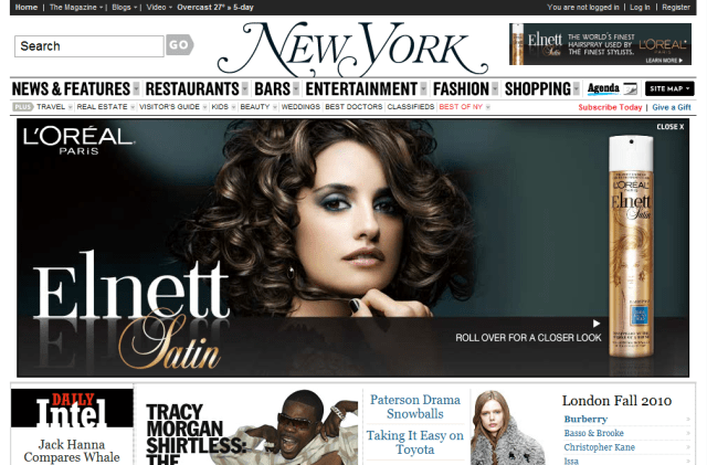New York Magazine has a 60% screen (laptop) ad banner on their frontpage today. Does anyone click this banner? Does it create happy readers? May I recommend sponsored content as in high quality, embedded material across the site, that does not disturb the magazine experience and quite possibly make people actually react and respond – maybe even positively! – to the advertiser.