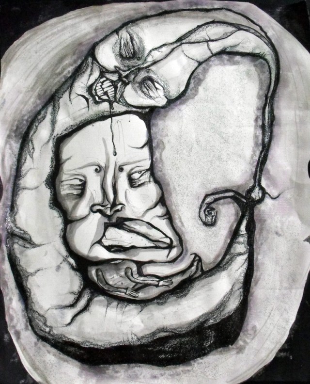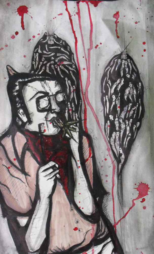 We always knew to expect great (or, at the very least, interesting) things from the daughter of two of rock’s darkest legends, and Frances Bean Cobain’s burgeoning art career has not disappointed. The 17-year-old offspring of Kurt Cobain and Courtney Love (pseudonym: Fiddle Tim) just put up her first gallery show Scumfuck at L.A.’s La Luz De Jesus Gallery.