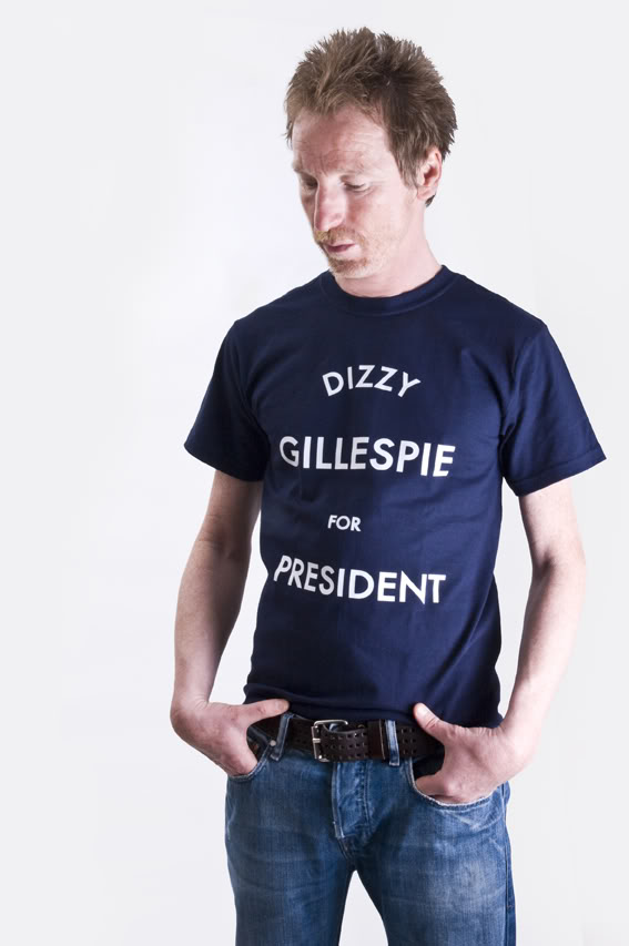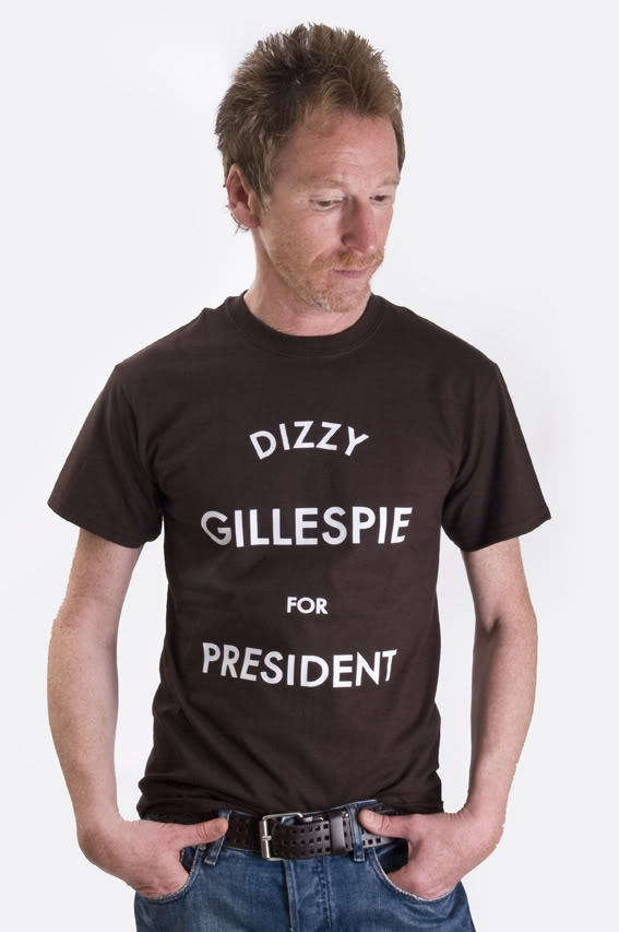 Taken from the opening credits of ‘The Presidents Analyst’ a 1967 movie starring James Coburn… a man pushes a clothing rail through the streets of downtown New York city, and what’s he wearing? A t-shirt bearing the legend ‘DIZZY GILLESPIE FOR PRESIDENT’, utter genius, and totally stylish, so someone decided to recreate this beauty in chocolate brown and navy.