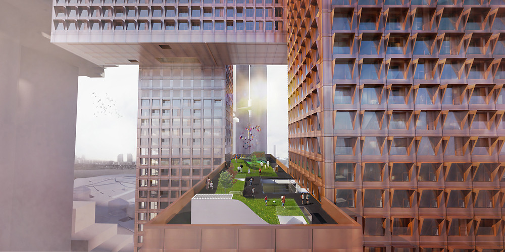 BIG’s latest project, the Cross # Tower, takes four minimalist high-rise blocs and combines them in a jarring gravity-defying tic-tac-toe composition. The 280,000 square foot complex consists of two towers that act as pylons to brace the other two blocs, which have been flipped on their sides and suspended in the air. The resultant “#” form achieves a delicate weaving of solid and void, of private and public space, that connects different sections of the complex mid-air. The tower, which is being planned for Yongsan International Business District of Seoul, envisions a new, close-knit residential unit, whose inhabitants are endeared to one another by the services and community space afforded to them by the structure’s form. [Source]