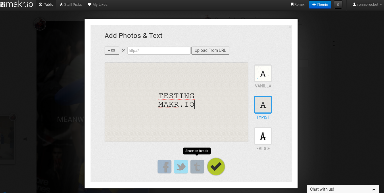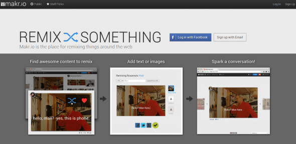 Taking MAKR.IO – the new service from the *Diaspora people – for a test ride. The first thing I noticed was a Facebook/E-mail log in and a Facebook/Twitter/Tumblr sharing function. Why no Twitter log in? Strange. I know why there are no Google buttons in sight.