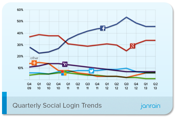 Google has gradually closed the gap on Facebook as the second most popular choice, and its share increased a fraction of a percent during Q2. While still trending in an increasing direction, its growth slowed despite Janrain’s launch of Google+ Sign-in in April.