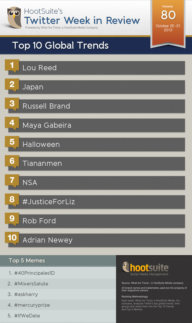 There are over 300 million tweets sent from around the world every day. Because Twitter has become such a major source for global news and conversations, Hootsuite pull weekly trends to discover what the world is talking about. Here’s some of the highlights.