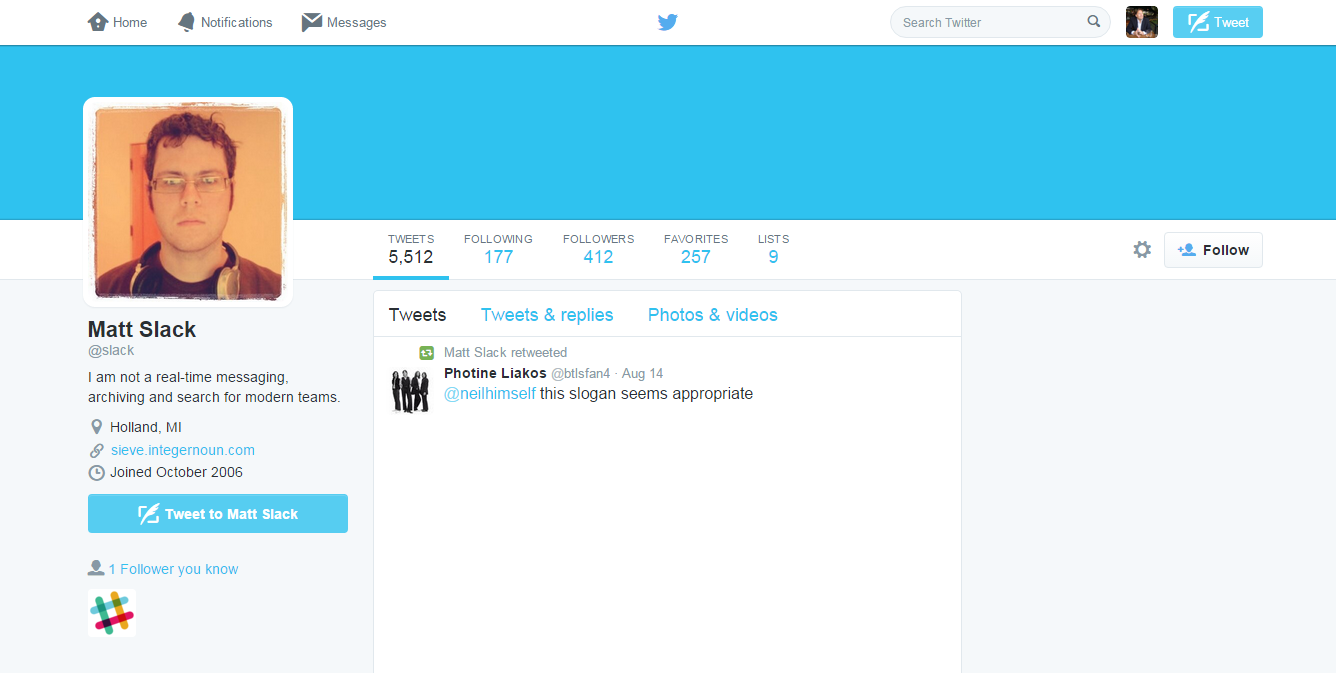 Sometimes, I look up a company by typing in their brand name directy after twitter.com. I wanted to mention LEGO in a quote, but found out that they are actually called @LEGO_GROUP. I wanted to ask Slack something, but found our that they are actually called @SlackHQ.